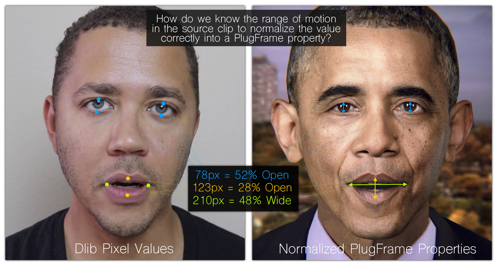 When I wrote the initial dlib converter in the spring of 2018 (with some initial help from Antonio and Jesse), it was done quickly in order to get it up and running in time for demos. At that time, we had a single Mindtwin - Obama. So, the converter was written to make PlugFrames from a set of dlib points in order to work with the bulk of clips of Reggie, our Obama impersonator. Hacks were employed in order to translate data to the puppet in the form of PlugFrames.
